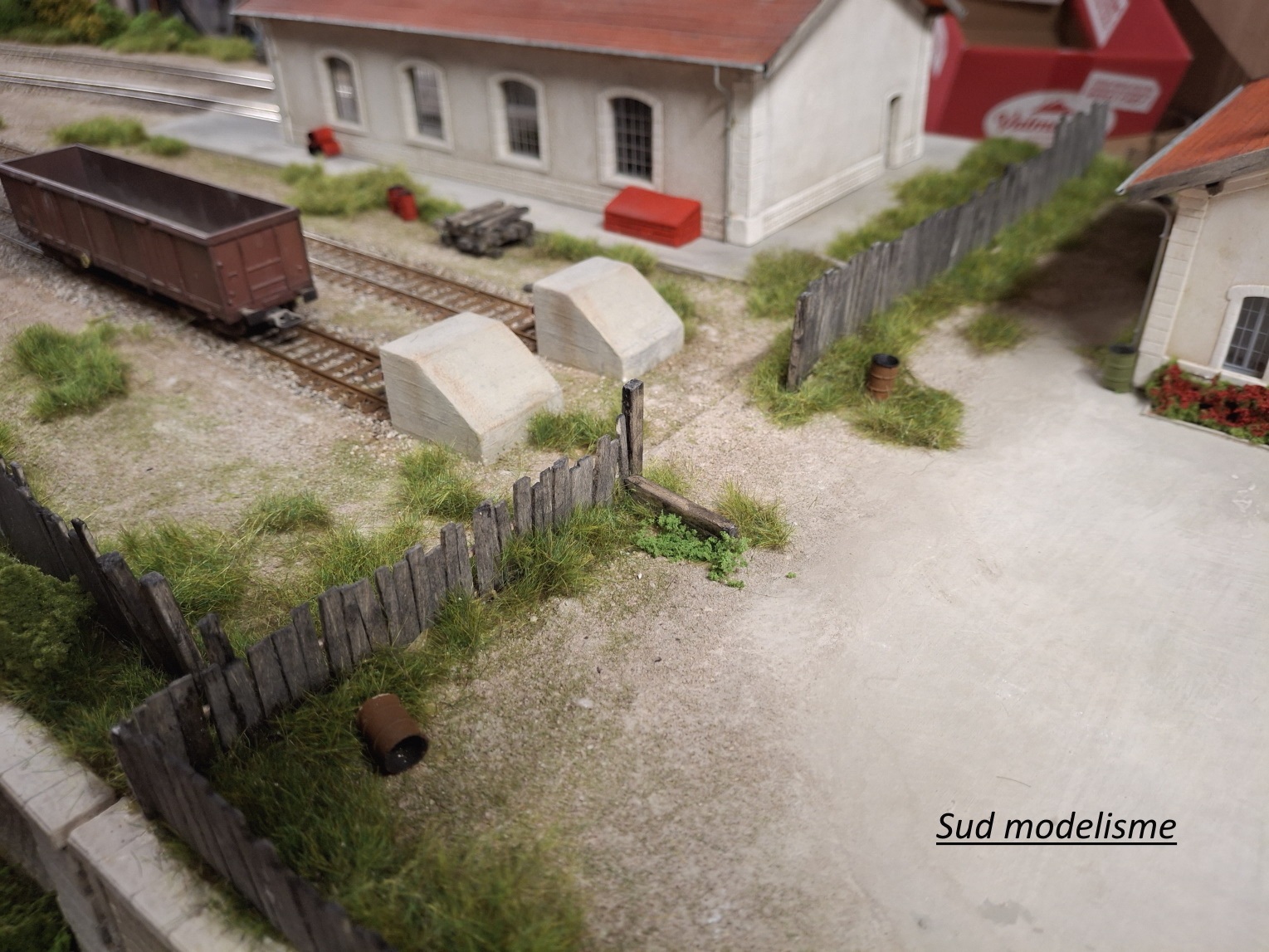 Ce type de heurtoir est en béton armé, légèrement incliné sur l’arrière pour l’écoulement de l’eau. Devant le heurtoir, se trouve une traverse de tamponnement (de moulage sur la maquette). Quantité : x 2 heurtoirs moulés en pierre synthétique